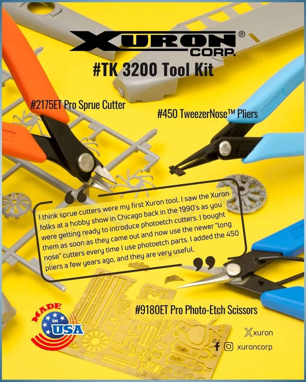These advancements underscore the importance of evolving as a modeler. Whether you’re a beginner or a seasoned enthusiast, trying new methods can expand your skills and take your kits to the next level. Contemporary tools, like Xuron®’s specialized cutters, have become essential in achieving precise and efficient builds. For Scott, tools like the Xuron® 2175ET Professional Sprue Cutter, 9180ET Professional Photo-Etch Scissors, and Model 440 TweezerNose™ Pliers have become staples in his toolbox, significantly improving his handling of delicate parts.